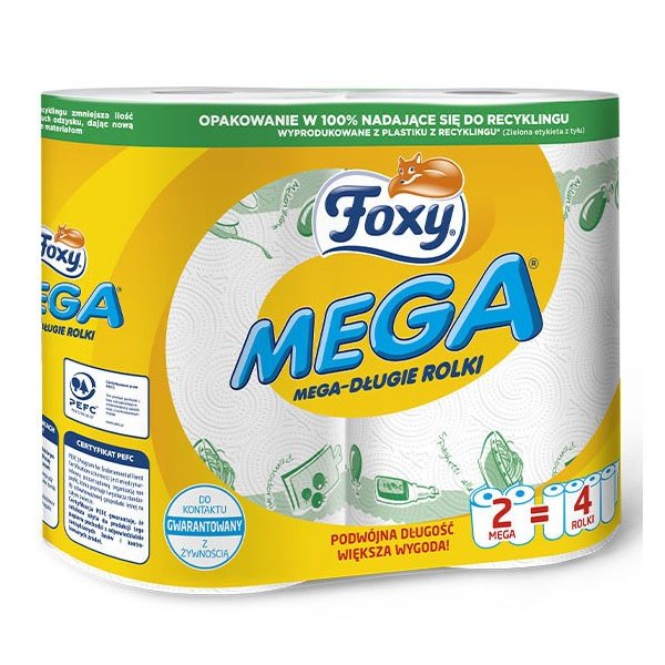 Każde opakowanie Foxy MEGA Ręczników Papierowych zawiera 2 rolki, co zapewnia długotrwałe użytkowanie. Praktyczne opakowanie zapewnia łatwe przechowywanie i wygodny dostęp do ręczników papierowych.