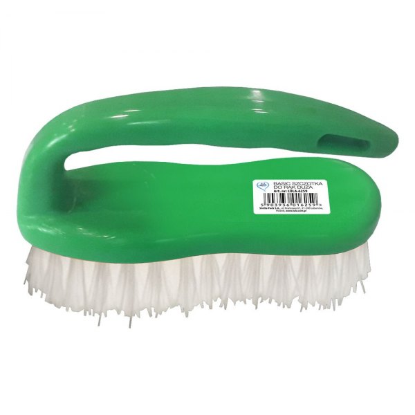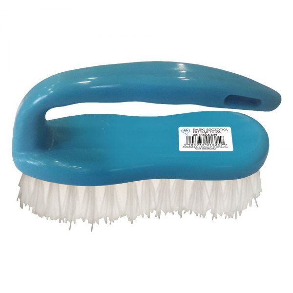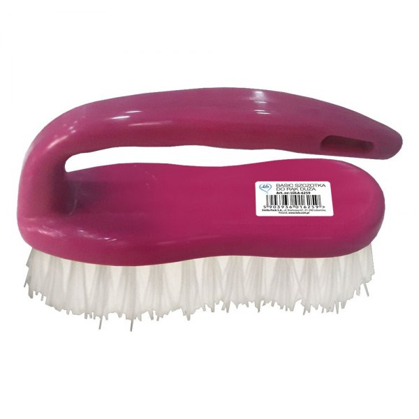 Szczotka do czyszczenia rąk i paznokci z syntetycznym włosiem w kolorze szarym. Posiada wyprofilowany uchwyt ułatwiający trzymanie.