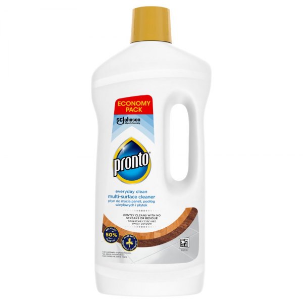 Nic nie robi lepszego wrażenia niż idealnie lśniąca podłoga. Pronto płyn do mycia paneli, podłóg winylowych i płytek nadaje podłogom lśniące piękno dzięki wolnej od olejków, bezproblemowej formule i nie zostawia żadnych osadów ani smug. Po sprzątaniu zostaje wyłącznie naturalny blask i połysk w domu, który kochasz.