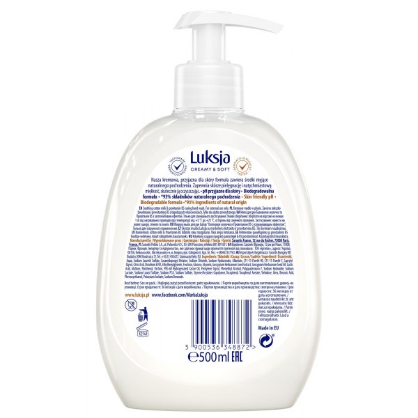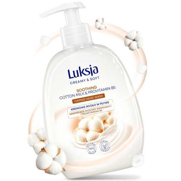 Kremowe mydło w płynie Luksja Mleczko bawełniane i Prowitamina B5 łagodnie oczyszcza i pielęgnuje dłonie podczas każdego mycia. Delikatna formuła zawiera mleczko bawełniane i prowitaminę B5, znane z odżywczych i zmiękczających właściwości, by zapewnić uczucie nawilżonej i miękkiej skóry. Została wzbogacona o glicerynę, która wykazuje doskonałe działanie pielęgnujące.