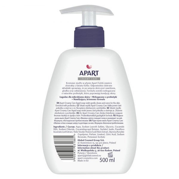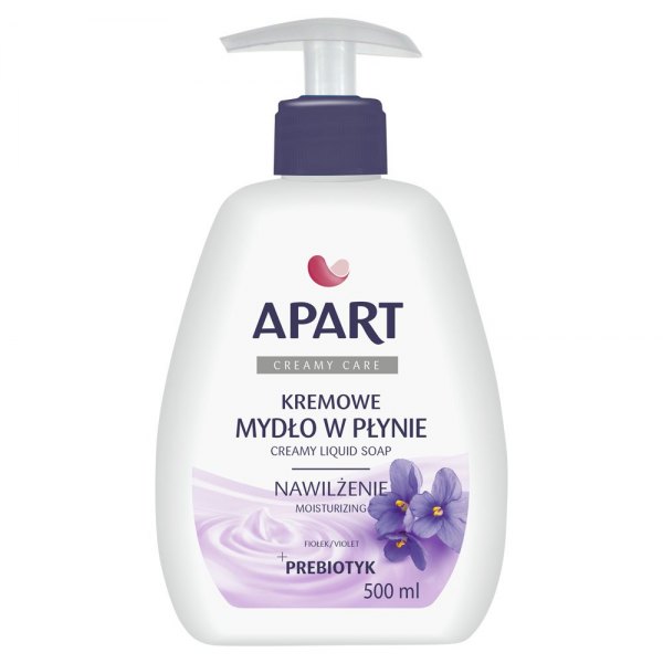 Nawilżające mydło w płynie Apart Creamy Care ma wspaniale kremową konsystencję, która podczas mycia przeistacza się w delikatną piankę. Jego formuła zawiera naturalne prebiotyki, dzięki czemu mydło dba o równowagę mikrobiomu Twojej skóry oraz łagodnie wspiera jej regenerację z każdym zastosowaniem. Całe mnóstwo odżywczych składników sprawia, że skóra staje się bardziej gładka i elastyczna oraz optymalnie nawilżona. Kompozycja zapachowa na bazie fiołka z wanilią czyni codzienną pielęgnację jeszcze przyjemniejszą.