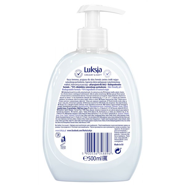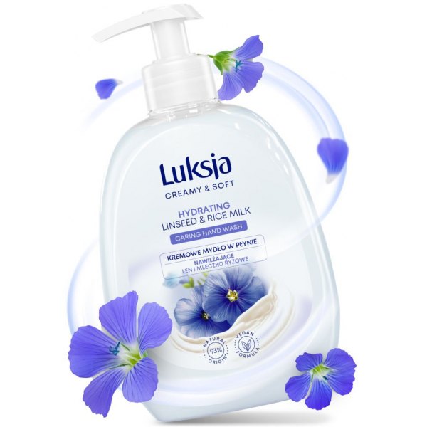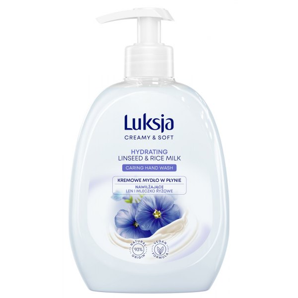 Kremowe mydło w płynie Luksja Len i Mleczko ryżowe łagodnie oczyszcza i pielęgnuje dłonie podczas każdego mycia. Delikatna formuła zawiera ekstrakt z lnu i mleczko ryżowe, znane z kojących i zmiękczających właściwości. Została wzbogacona o glicerynę, która wykazuje doskonałe działanie pielęgnujące.