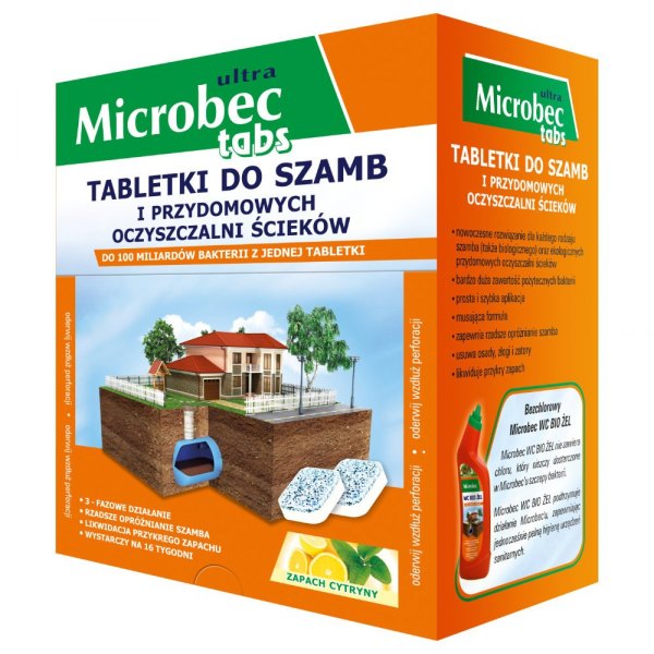 Mikrobiologiczny preparat enzymatyczny w postaci tabletek do biodegradacji zawartości szamba. Systematyczne stosowanie Microbecu zmniejsza częstotliwość opróżniania szamba, wspomaga pracę przydomowych oczyszczalni ścieków, usuwa nieprzyjemny zapach i udrażnia system instalacji sanitarnej. Tabletki posiadają dwufunkcyjne działanie - niebieska część udrażnia i czyści natomiast biała zawiera bakterie i enzymy.
