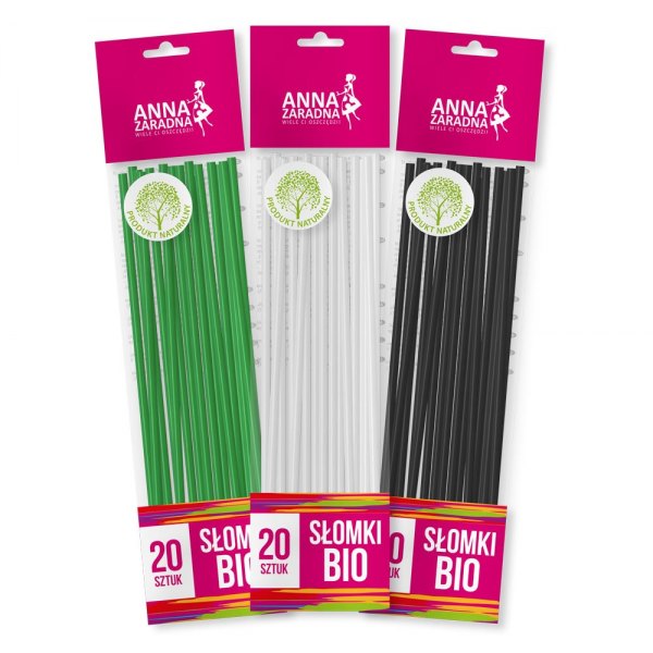 Słomki BIO Anna Zaradna dostępne w trzech kolorach: białym, czarnym i zielonym, są idealną ekologiczną alternatywą słomek plastikowych. Są one przyjazne dla środowiska. Idealnie sprawdzają się przy napojach zimnych i ciepłych, podczas towarzyskich spotkań na świeżym powietrzu jak i w domowym zaciszu. Słomki są wykonane z mączki kukurydzianej, która jest tworzywem wytwarzanym z odnawialnych surowców roślinnych i jest surowcem w 100% kompostowalnym i biodegradowalnym. Pity przez słomkę napój nie zmienia smaku. Produkt jednorazowego użytku.
