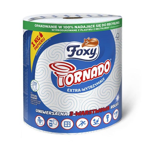 Każde opakowanie Foxy Tornado zawiera 1 rolkę, która zapewni Ci wydajność i długotrwałe użytkowanie. Praktyczne opakowanie zapewnia łatwe przechowywanie i wygodny dostęp do ręcznika papierowego.