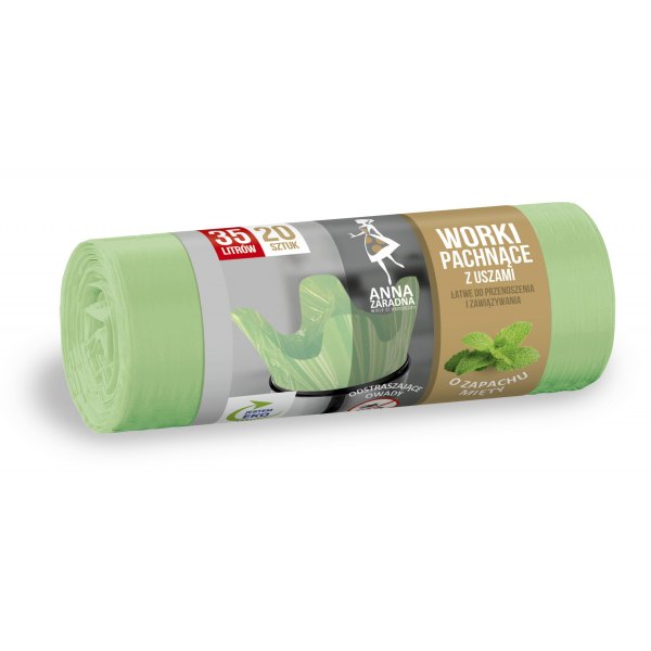 Worki na śmieci z uszami o zapachu mięty wykonane są z folii HDLD. Szczelny zgrzew typu gwiazda zapobiega przeciekaniu zawartości worka do pojemnika i sprawia, że worki świetnie dopasowują się do okrągłych pojemników na odpady. Praktyczne "uszy" pozwalają na szybkie i higieniczne zawiązanie worka oraz jego przenoszenie. Znakomicie sprawdzą się w domu, biurze, miejscach publicznych czy placówkach medycznych, ale także przy grillu czy podczas prac około domowych. Worki posiadają silnie wyczuwalny zapach mięty, który skutecznie odstrasza insekty, owady oraz gryzonie, zapobiega to gromadzeniu się owadów wokół worka oraz rozrywaniu worka przez gryzonie (szczury, myszy i inne zwierzęta).